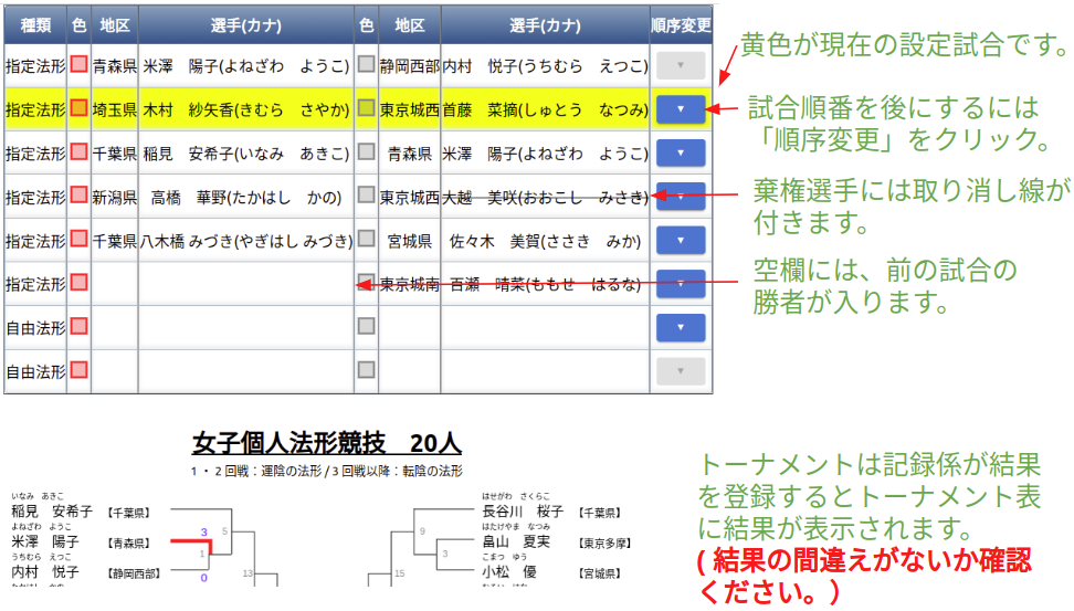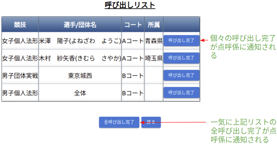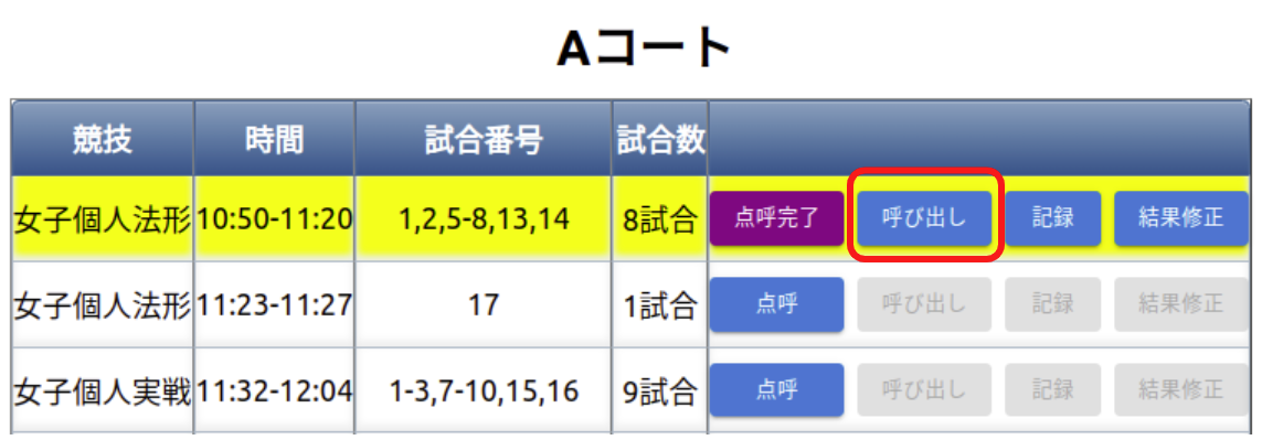 - 選手棄権が出ていないか競技開始前に確認する(以下の選手呼び出し画面で確認できます)。